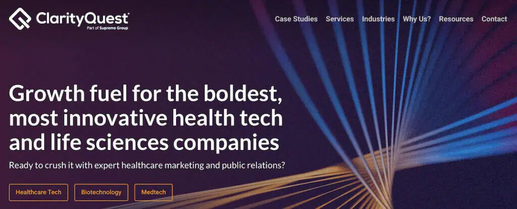 Clarity Quest is a U.S.-based healthcare and life sciences marketing agency. Our team helps translate complex technology and clinical value into clear, commercially effective storytelling. Founded in 2001, we specialize in health tech, biotech, and medtech services. We’ve been part of Supreme Group since being acquired in June 2023 and now work as part of Supreme Optimization (also featured later in this list).