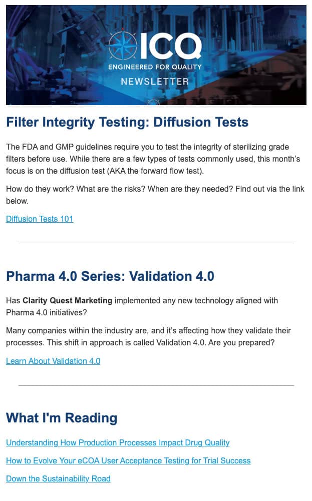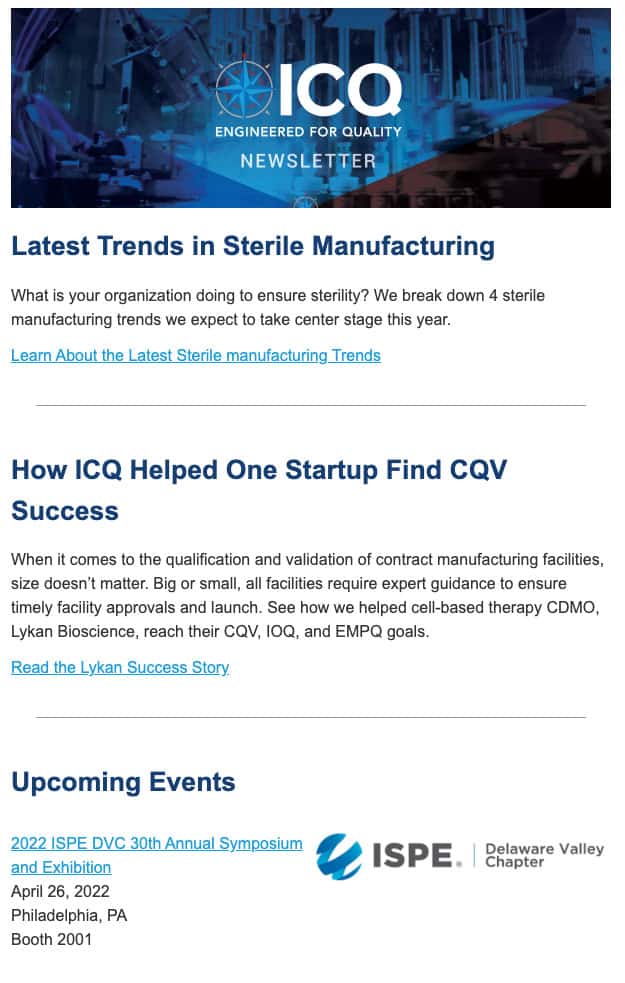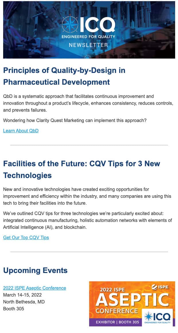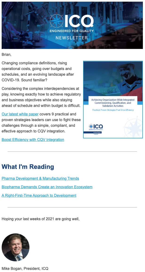 Sending useful, insightful content via email has helped ICQ Consultants stay at the top of their audience’s minds, including targets at major pharma companies and fueled a multi-year marketing program with great results influencing long pharmaceutical decision-making cycles.