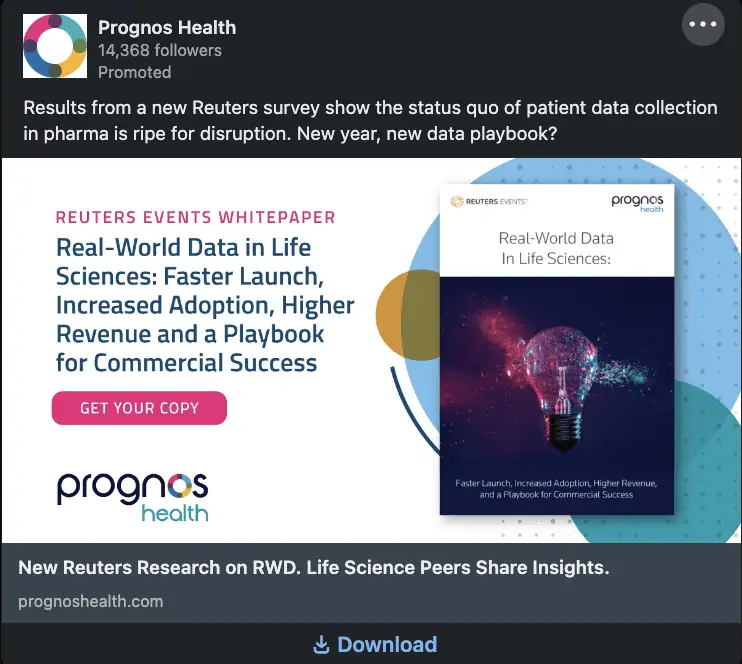 Prognos successfully reached senior-level pharmaceutical commercialization teams with an ongoing organic social and LinkedIn Ads lead generation campaign with varied content formats from case studies, sponsored reports, blogs, to webinars, videos and infographics as part of our ongoing digital marketing and lead generation strategy.